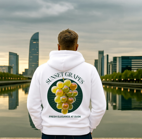 Willkommen bei Sunset Grapes – wo Style auf Komfort und Premium-Qualität trifft. Dieser Hoodie ist mehr als ein Kleidungsstück: Er ist ein Eyecatcher für alle, die Süße, Eleganz und einen Hauch Dämmerung lieben. Mit retro-inspiriertem Print ziehst du garantiert alle Blicke auf dich – absolut GRAPE ICONIC.