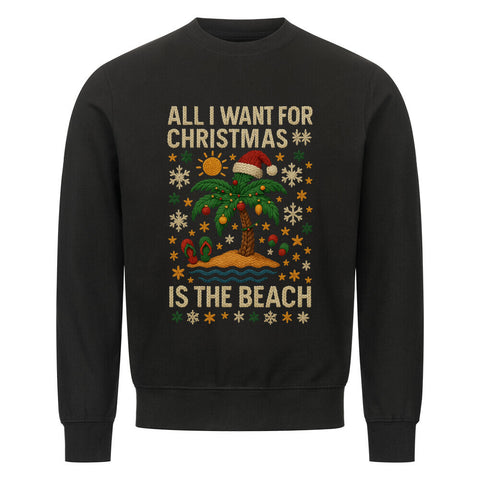 This ugly Christmas sweater brings a holiday feeling to winter. The design features a palm tree wearing a Santa hat , Christmas decorations, sand, flip-flops, and the phrase "All I Want for Christmas Is the Beach." Perfect for anyone who prefers sunshine to slush.