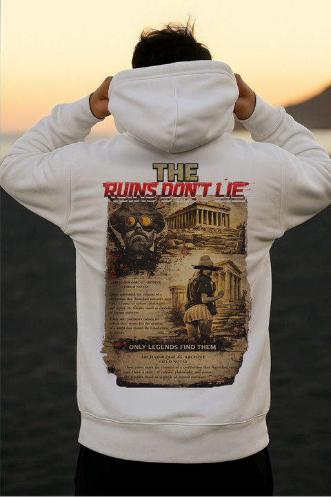 Der Heavy Cotton Oversized Hoodie „The Ruins Don’t Lie“ verbindet markantes Vintage-Backprint-Design mit hochwertiger Premium-Qualität. Das Artwork erinnert an alte Archive, vergessene Zivilisationen und legendäre Entdecker. Mit seinen sepiafarbenen Ruinen-Motiven, der markanten roten Typografie und dem collageartigen Print wirkt der Hoodie roh, geheimnisvoll und ausdrucksstark zugleich.