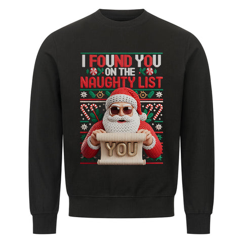 Dieser Ugly Christmas Sweater zeigt einen modernen, selbstbewussten Santa mit Sonnenbrille, der eine große Schriftrolle mit dem Wort „YOU“ präsentiert. Darüber der auffällige Spruch „I Found You On The Naughty List“ ein humorvolles Statement, das sofort für Lacher sorgt. Perfekt für alle, die ein auffälliges, modernes und witziges Weihnachtsmotiv suchen.