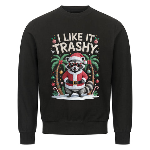 Dieser Ugly Christmas Sweater zeigt einen coolen Waschbär im Santa-Outfit, kombiniert mit stylischen Palmen, Weihnachtskugeln und dem Spruch „I Like It Trashy“. Das Design bricht bewusst mit klassischen Weihnachtsmotiven und bringt einen modernen, witzigen Twist in die Feiertage. Perfekt für Weihnachtsfeiern, Winterfotos oder als Geschenk für alle, die es humorvoll mögen.